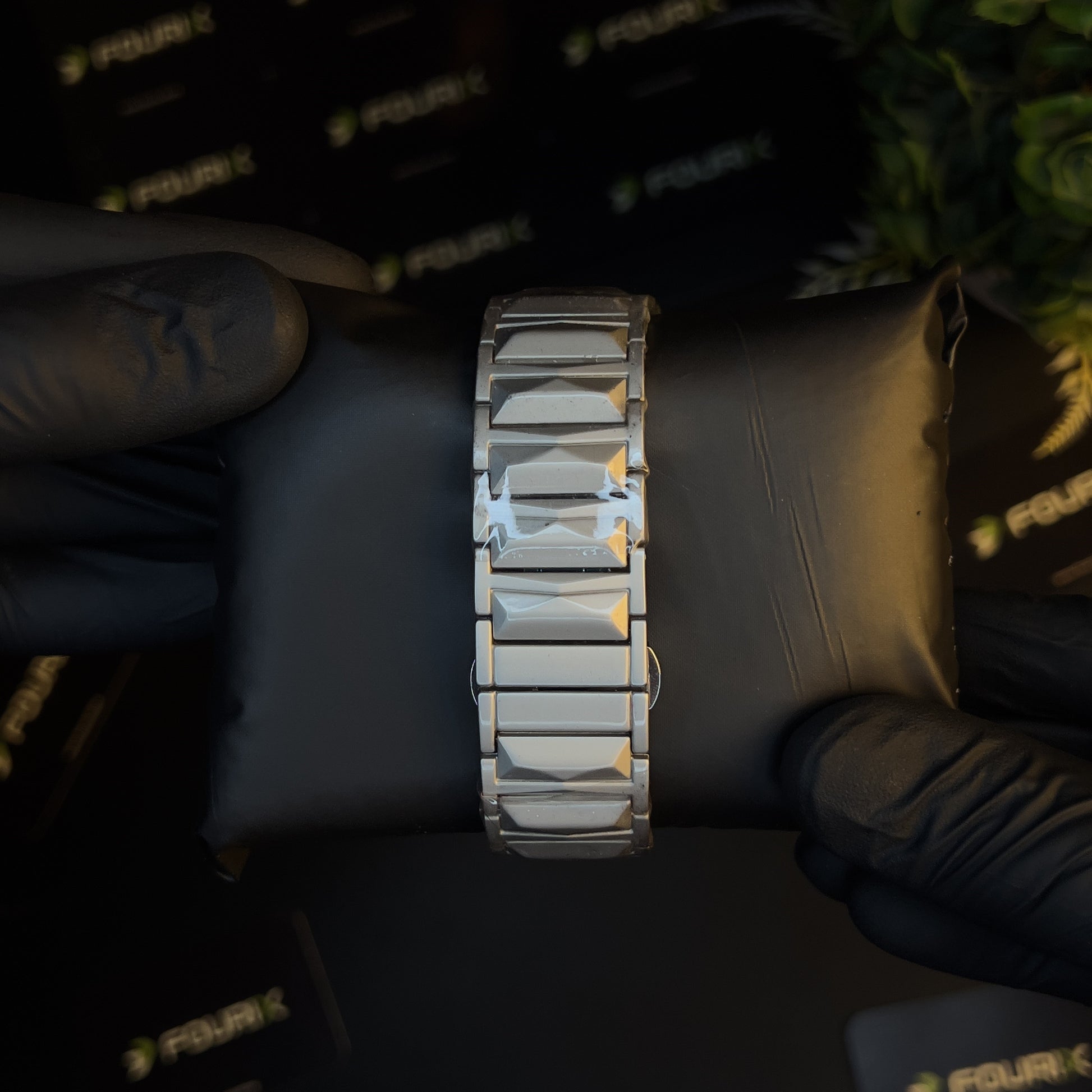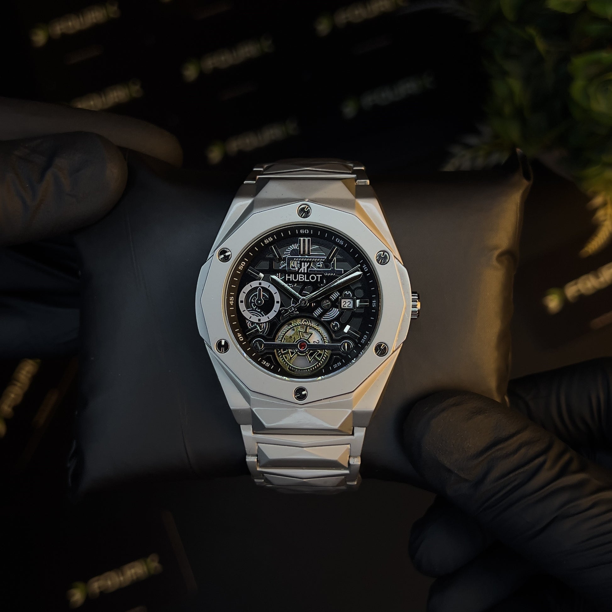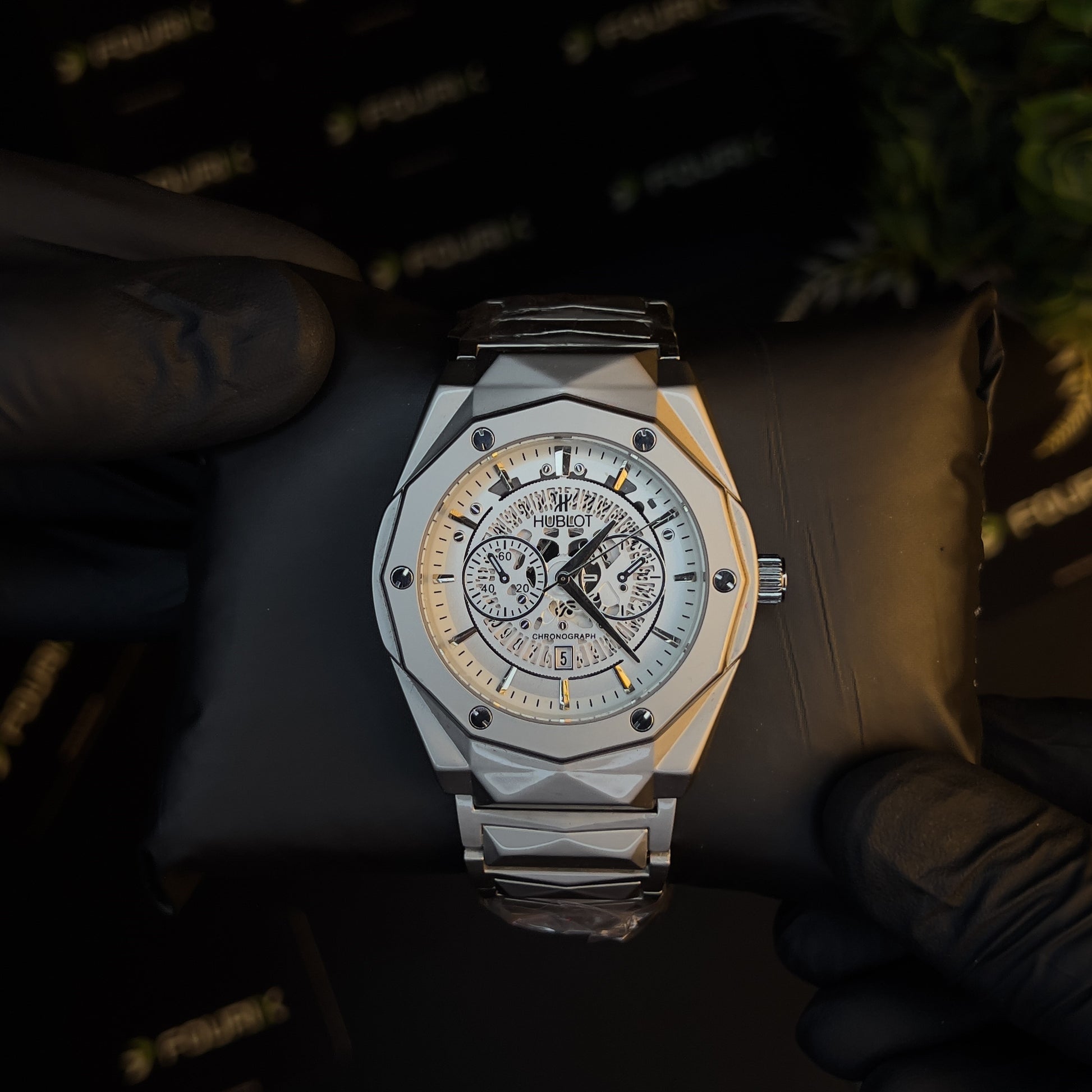 The Hublot Diamond Cut Chain Watch for men comes with a premium design and stylish chain strap. It shows clear date and time, is strong, comfortable to wear, and perfect for daily use or special occasions